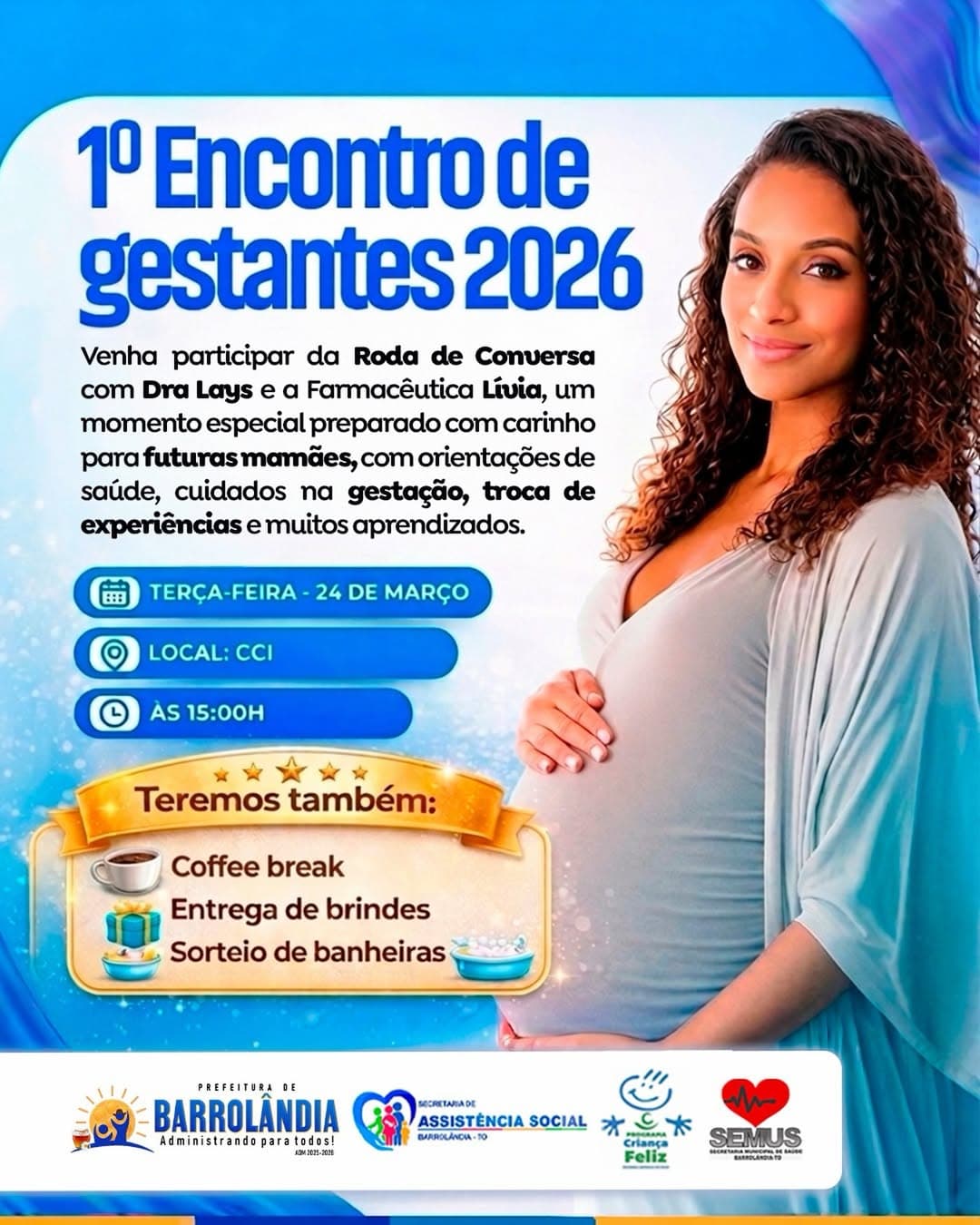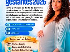 Cuidado com a Vida No dia 24 de março, às 15h, o Centro de Convivência do Idoso (CCI) recebe o 1º Encontro de Gestantes 2026. Em uma parceria entre as secretarias de Assistência Social e Saúde, as futuras mamães participarão de uma roda de conversa com a Dra. Lays e a farmacêutica Lívia. O evento contará com orientações, coffee break, sorteio de banheiras e entrega de brindes, visando um pré-natal mais humanizado e informativo.