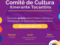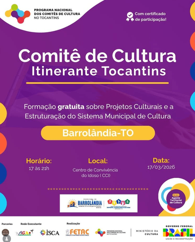 Fomento Cultural Também no dia 17, o Comitê de Cultura Itinerante Tocantins desembarca na cidade. Das 17h às 21h, o diretor e produtor Nival Correia ministrará uma formação gratuita e certificada para artistas e entusiastas da cultura local, com o apoio da Secretaria de Educação, Esporte, Juventude e Cultura.