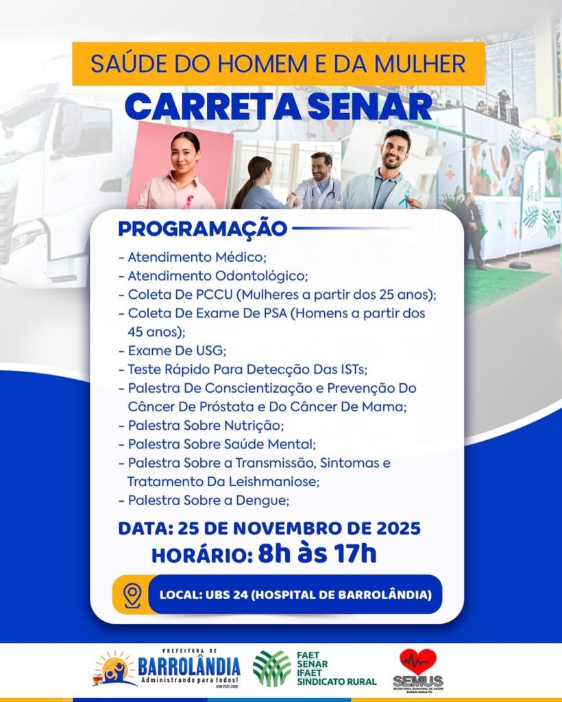 A Carreta da FAET/SENAR estará estacionada no Sindicato Rural no dia 25 de novembro, oferecendo uma vasta gama de atendimentos e serviços essenciais à população. A iniciativa visa facilitar o acesso a exames preventivos e promover a saúde integral de homens e mulheres do município.