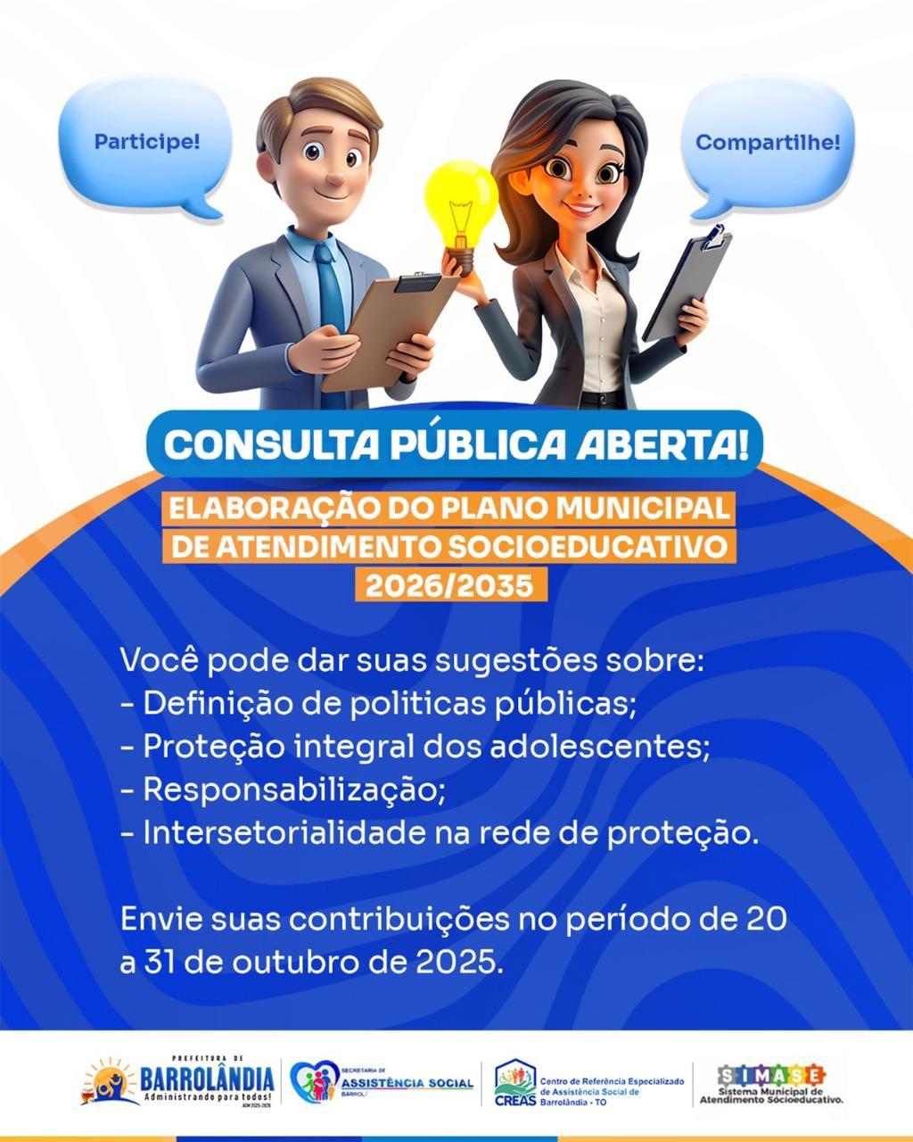De 20 a 31 de outubro de 2025, a população está convidada a participar da Consulta Pública sobre o Plano Municipal de Atendimento Socioeducativo de Barrolândia. Esse plano é essencial para nortear as ações de atendimento socioeducativo em nosso município, com diretrizes e estratégias para a implementação de medidas socioeducativas em meio aberto, conforme preconizado pelo Estatuto da Criança e do Adolescente (ECA) e pelo Sistema Nacional de Atendimento Socioeducativo (SINASE).