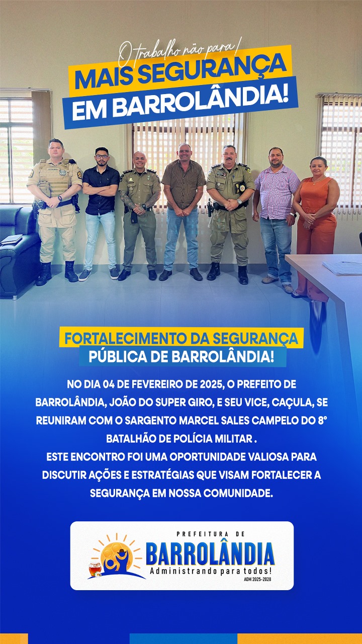 O encontro reforça a parceria entre a Prefeitura e a Polícia Militar e demonstra o compromisso da gestão municipal com a segurança e qualidade de vida dos barrolandenses. A administração segue empenhada em desenvolver políticas públicas que fortaleçam a proteção e o bem-estar da população, garantindo que Barrolândia continue sendo uma cidade segura e acolhedora para todos.